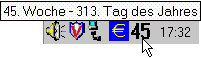 for Windows 10 (vom 16. January 2020) ![]() A program that display the calendar week in the SystemTray. If the mouse pointer is over the calendar week, the calendar week and the current day of the year is displayed.